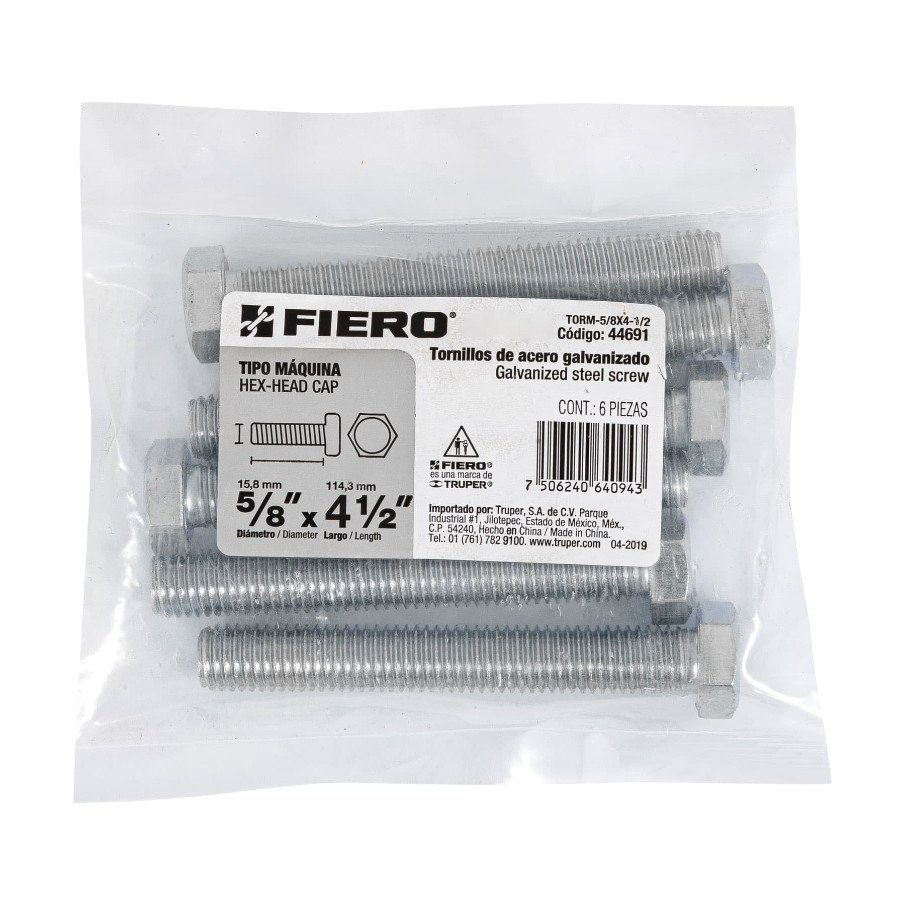 Bolsa con 6 tornillos 5/8 x 4-1/2 tipo máquina, FIERO – Truper