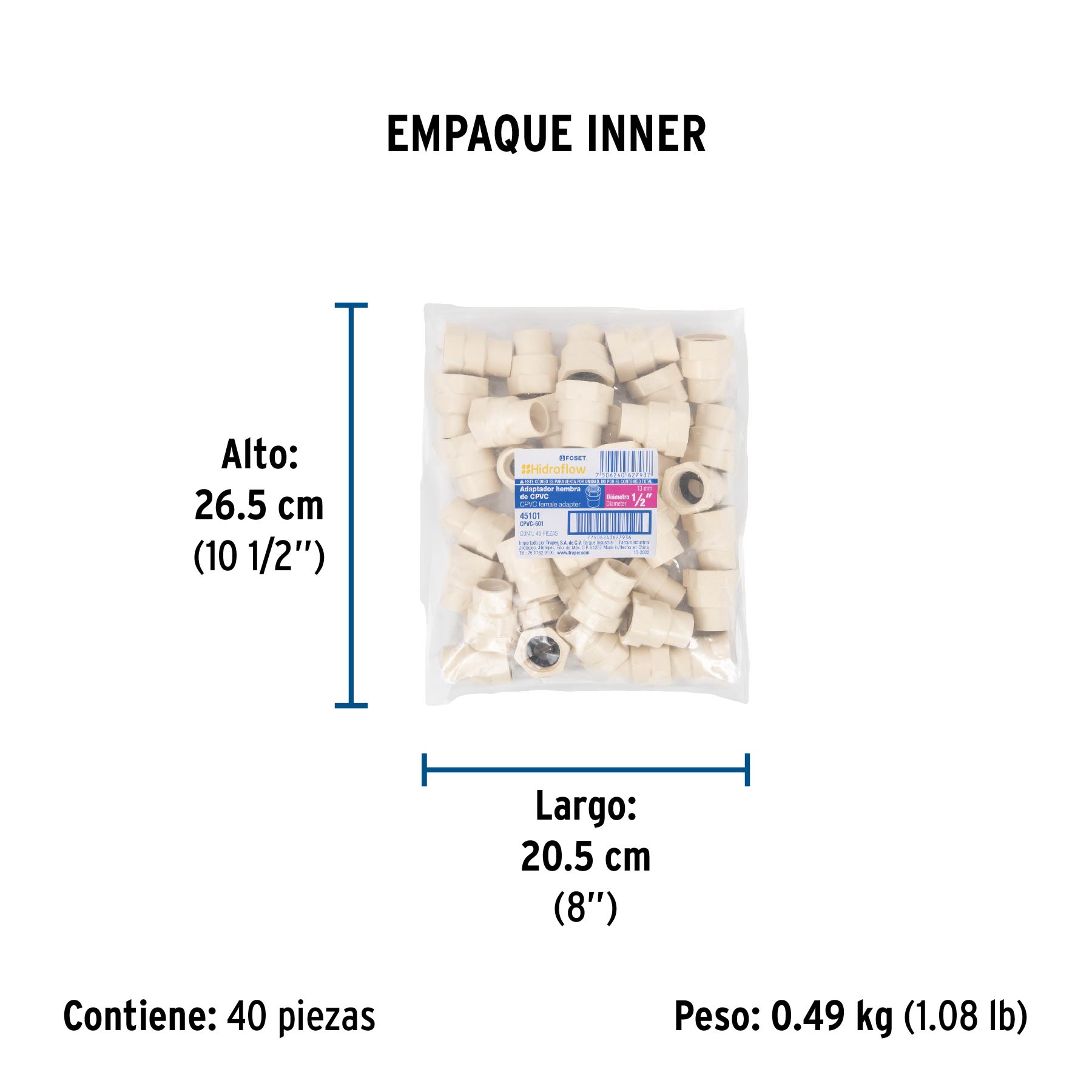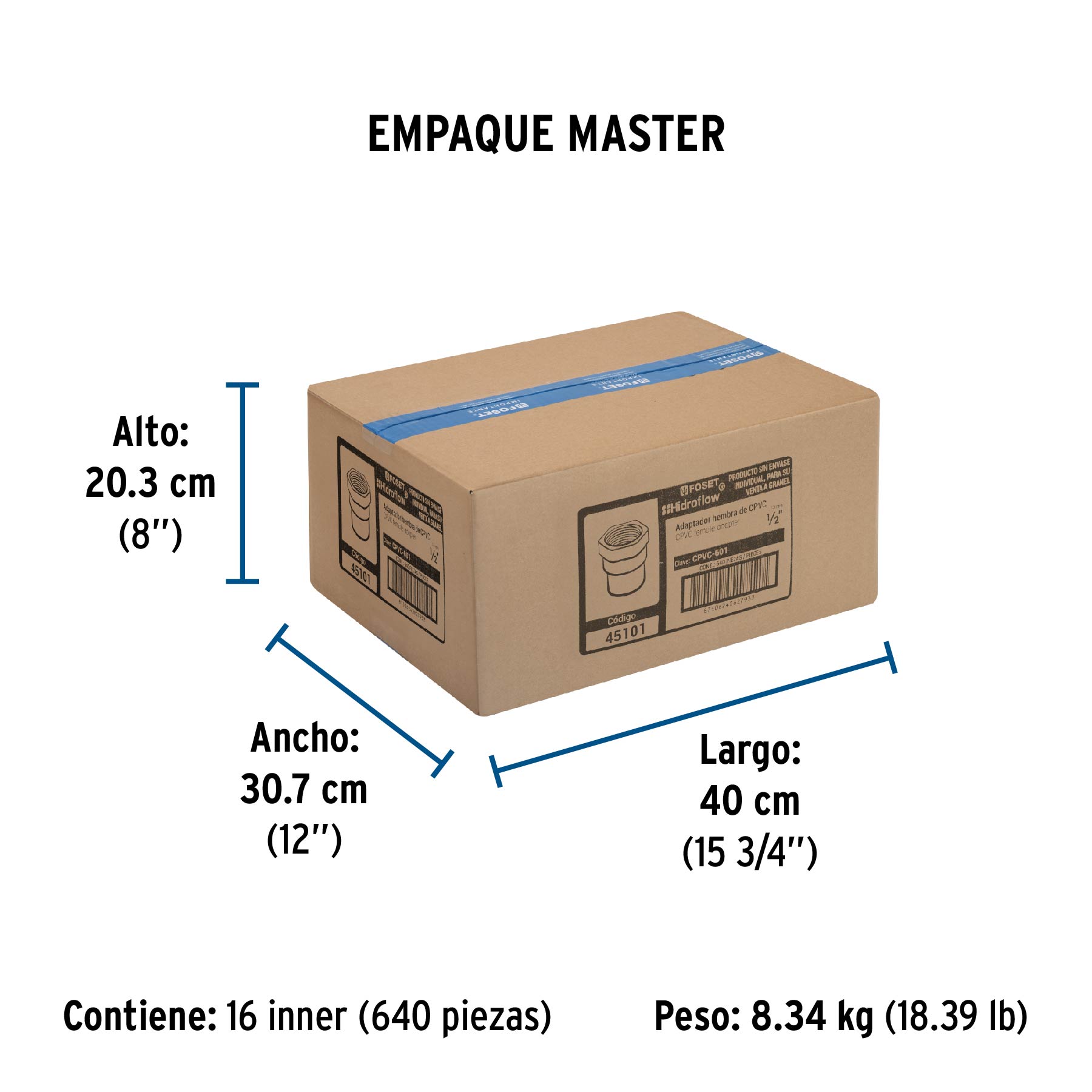 Las imágenes de los productos son ilustrativas y pueden diferir del producto real. Por favor, lea detenidamente las especificaciones, advertencias e instrucciones antes de utilizar cualquier producto. La garantía aplica únicamente ante fallas derivadas de defectos de fabricación. Quedan excluidos de cobertura los daños provocados por uso indebido, abuso o manejo inadecuado. Codigo 45101 Clave CPVC-601