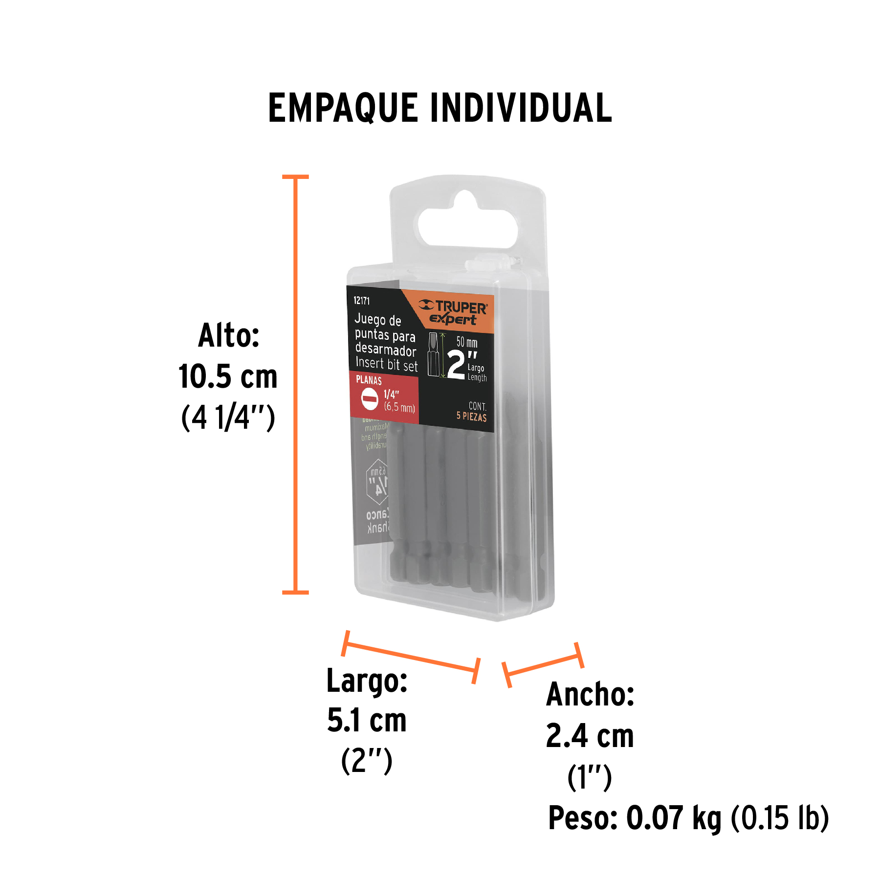 Estuche con 5 puntas planas de 1/4 largo 2, Truper Expert