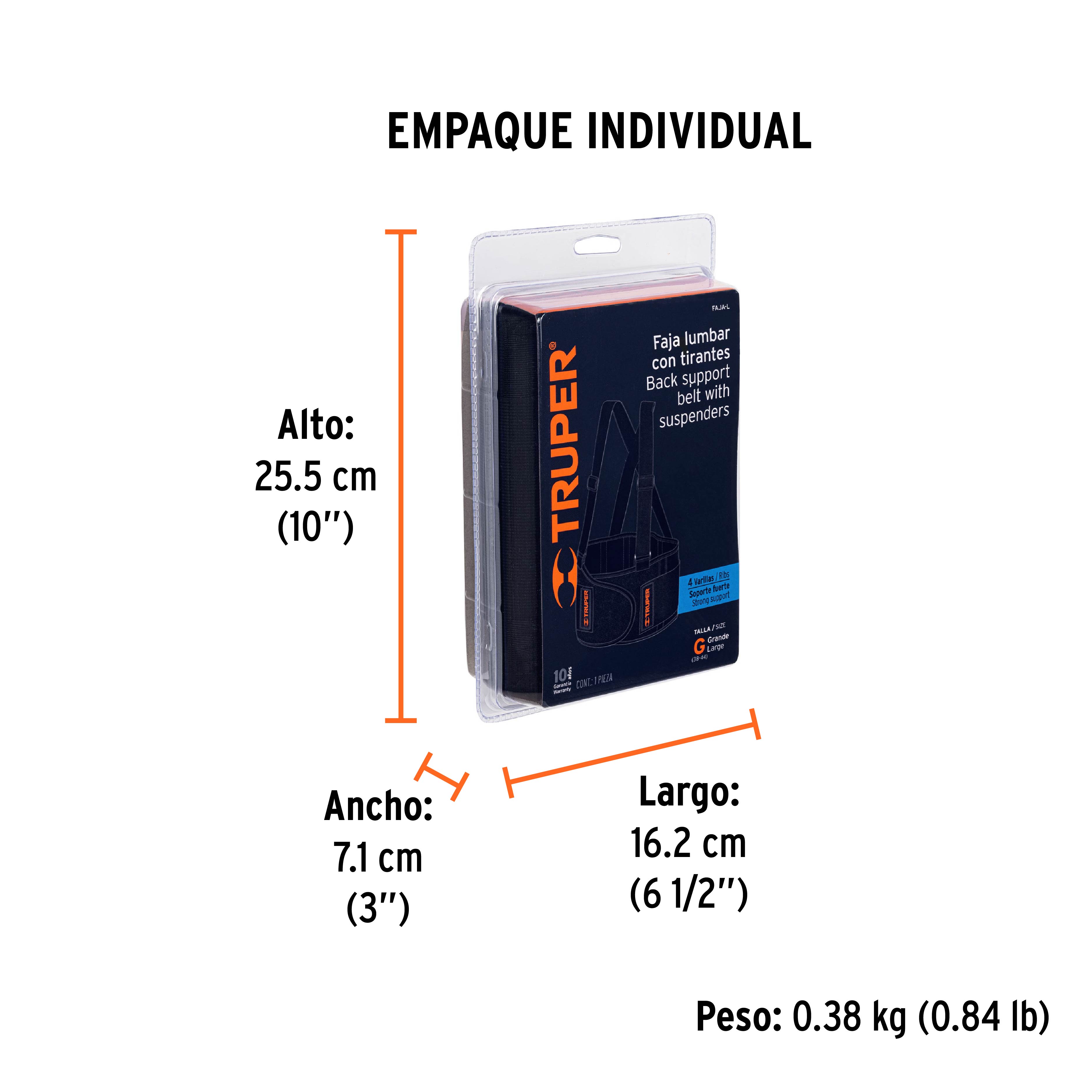 Las imágenes de los productos son ilustrativas y pueden diferir del producto real. Por favor, lea detenidamente las especificaciones, advertencias e instrucciones antes de utilizar cualquier producto. La garantía aplica únicamente ante fallas derivadas de defectos de fabricación. Quedan excluidos de cobertura los daños provocados por uso indebido, abuso o manejo inadecuado. Codigo 14238 Clave FAJA-L