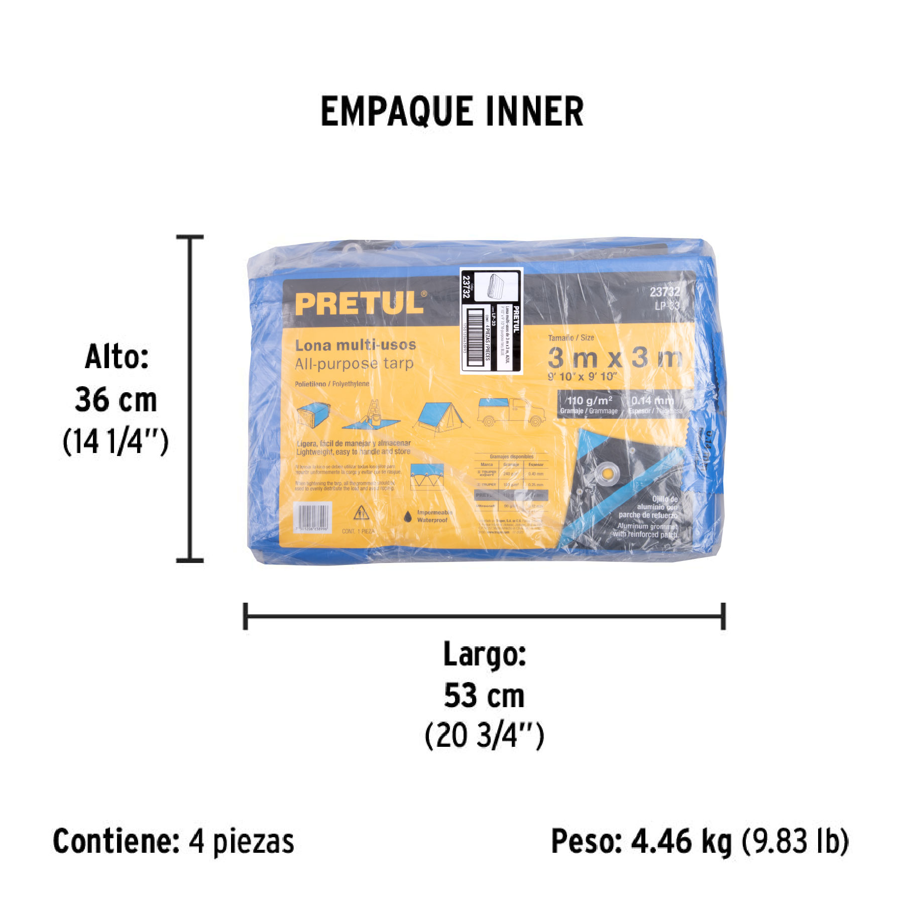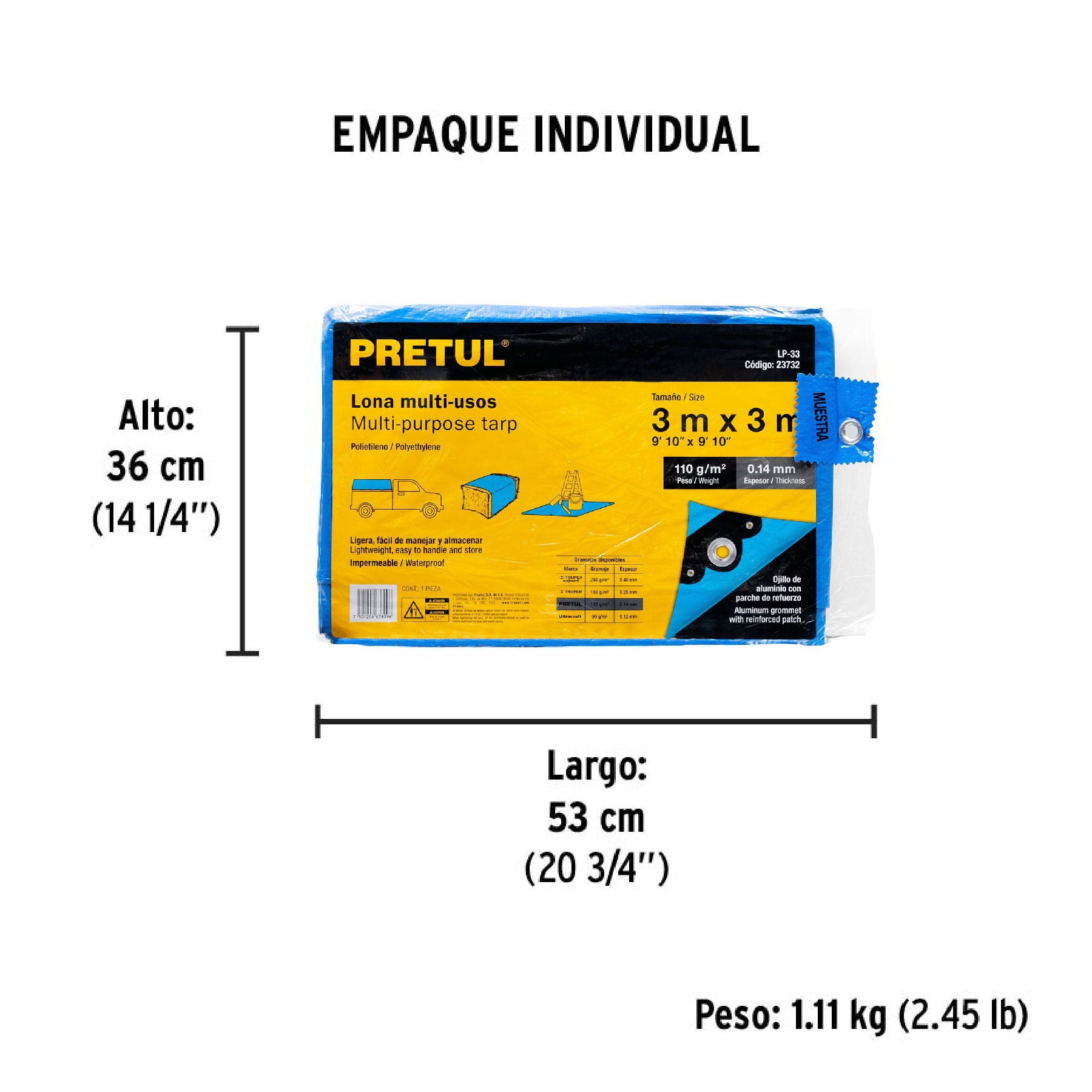 Lona de polietileno 3 x 3 m, azul, 110 g/m2, PRETUL – Truper